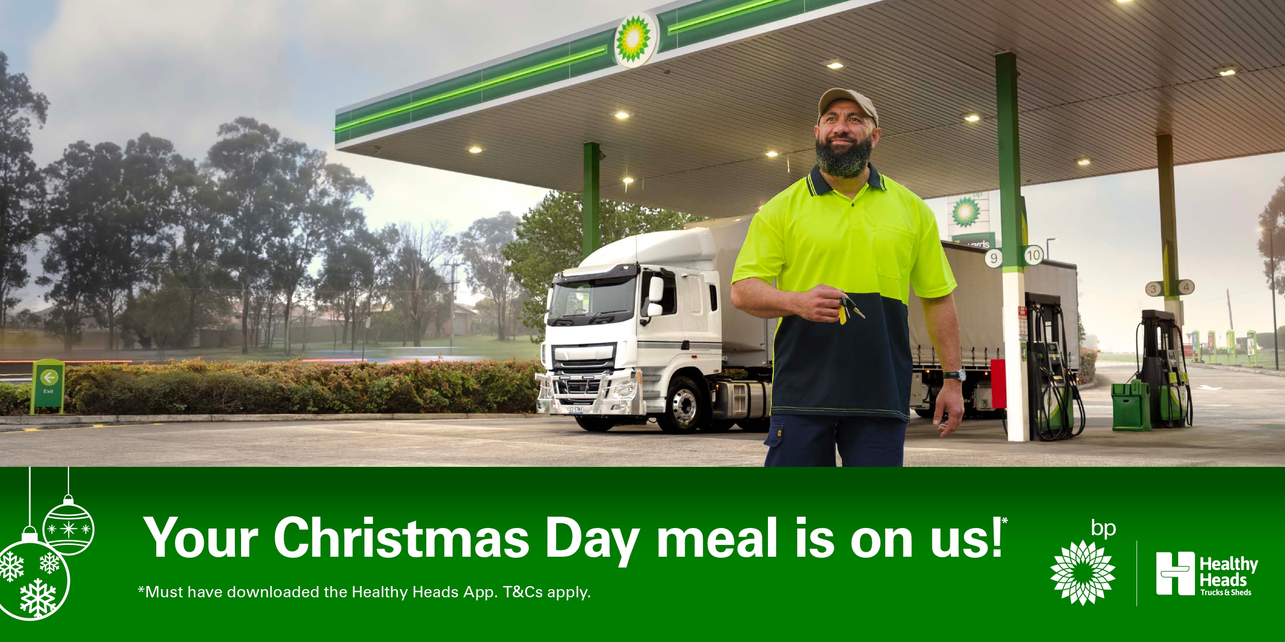 bp and Healthy Heads in Trucks & Sheds would like to thank those working on Christmas Day across the road transport, warehousing and logistics industries with a free Christmas Day meal!*