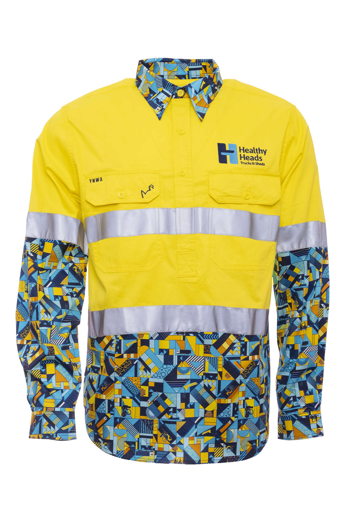 Healthy Heads TradeMutt hi vis shirt – includes a QR code under the pocket linking directly to the TIACS free counselling service.